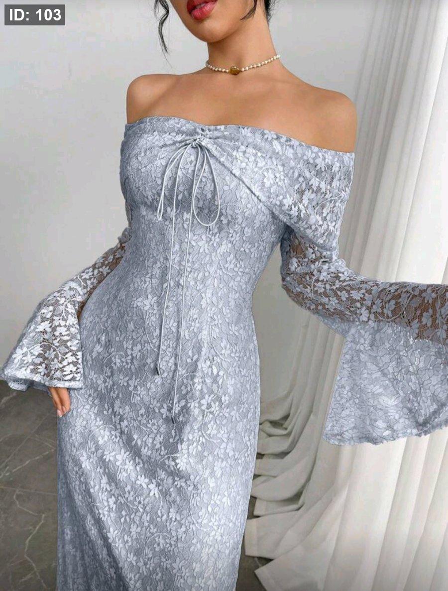 Modelyn فستان طويل أنيق للنساء بأكمام واسعة وأكتاف مكشوفة طراز الدانتيل باللون الواحد