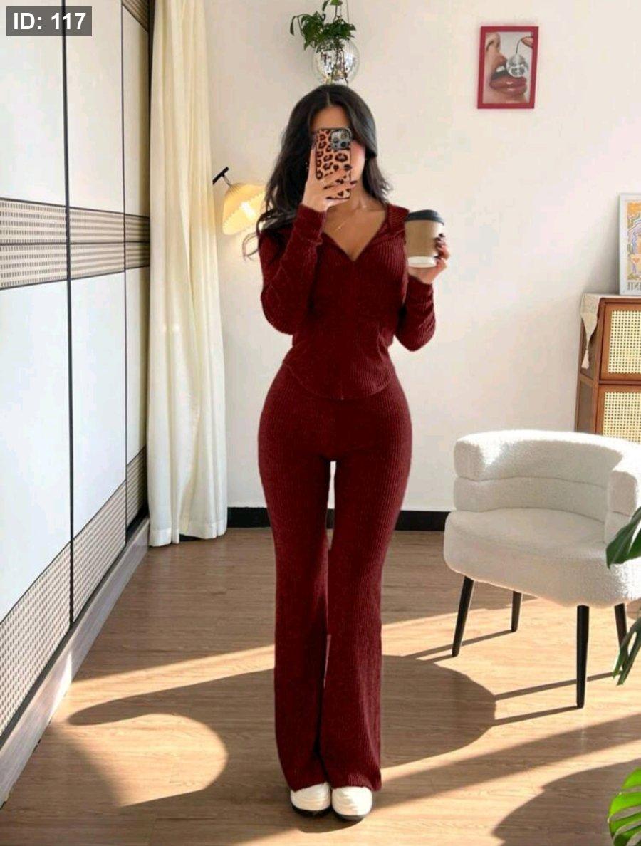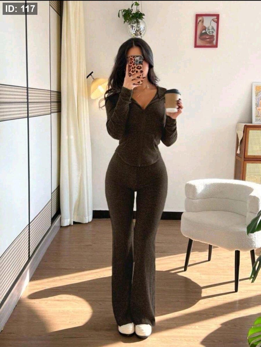 بدلة نسائية مكونة من جاكيت مقنعة بخصر ضيق وجيوب، وبنطال مضلع متسع ، مناسبة للارتداء اليومي في فصلي الخريف والشتاء