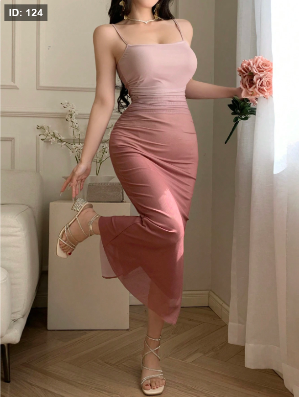 فستان نسائي باللون البارز مع حمالات رفيعة أنيق