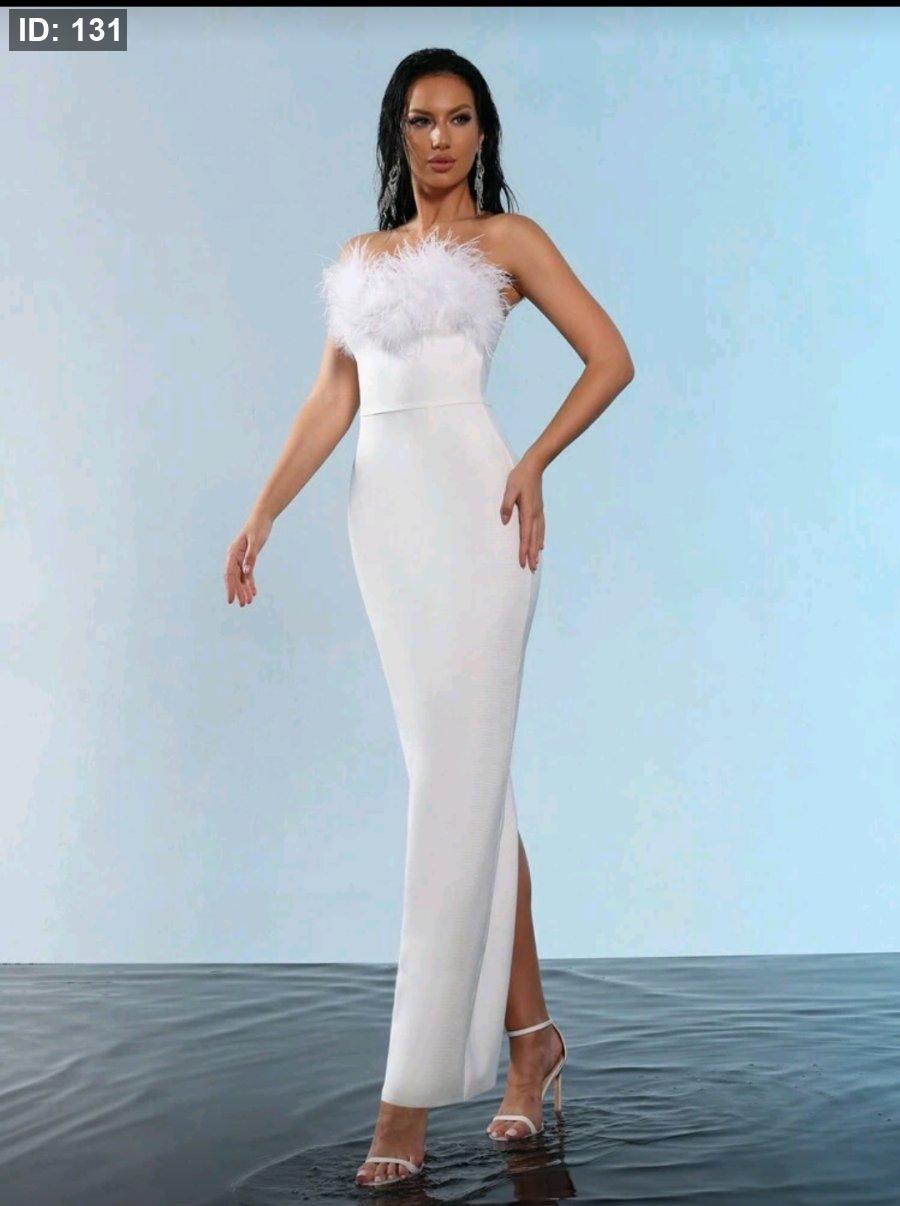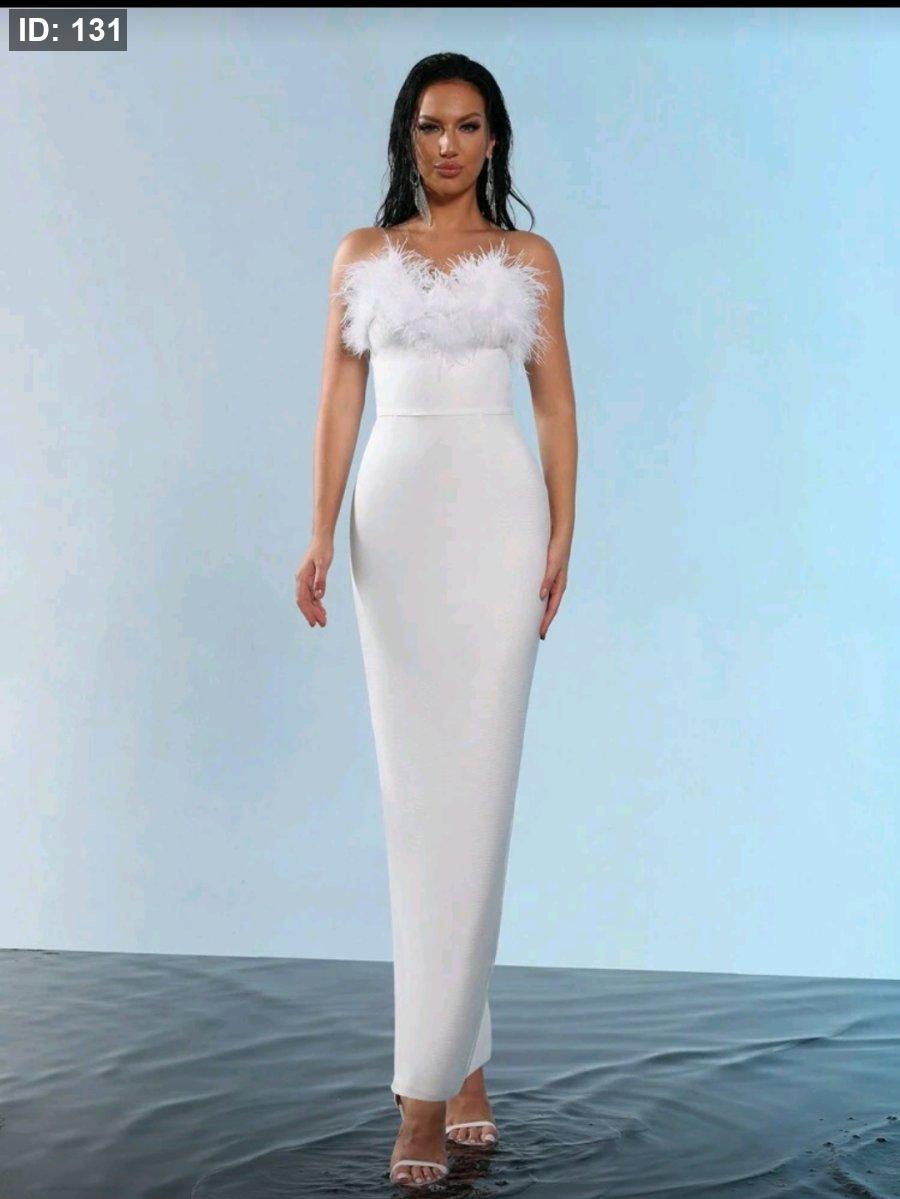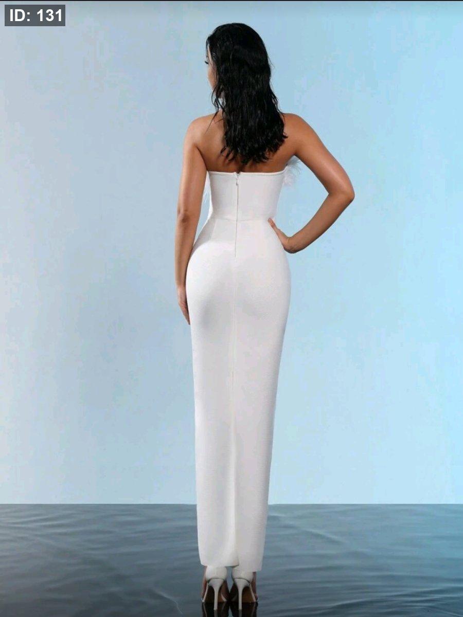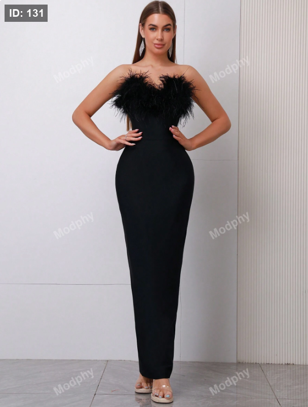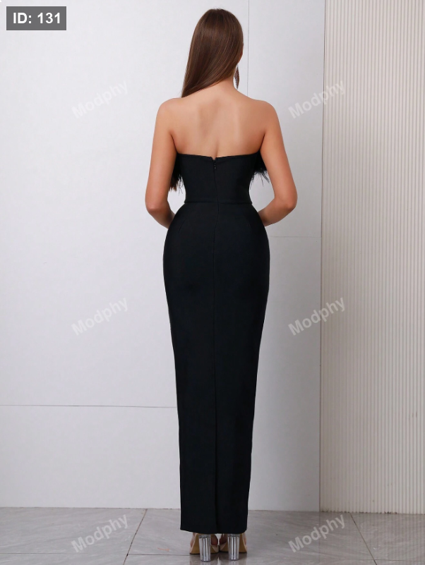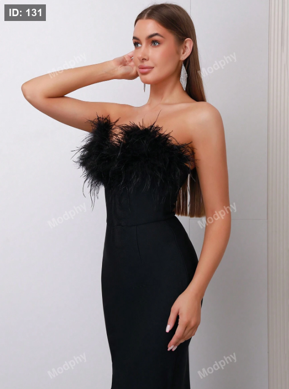 فستان ماكسي مرتفع من الخصر من نسيج مطاطي مزين بريش صناعي، بدون أكتاف أو ظه