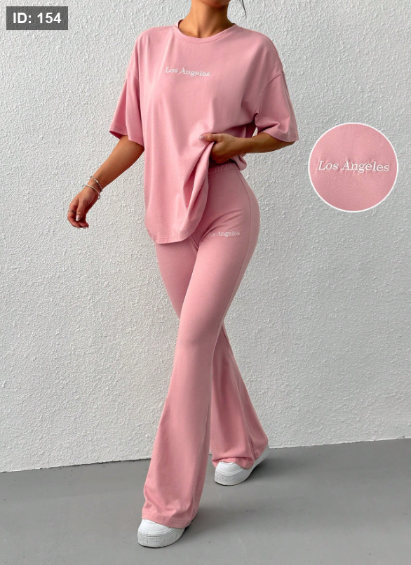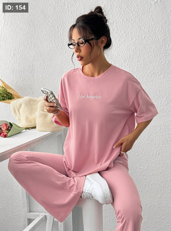 بدلة بنطال مع قصة ملتفة مطرزة بخطوط وردية محبوكة