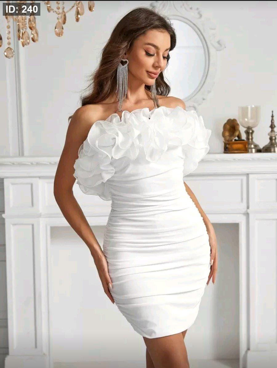فستان بدون حمالة مطوي من لون واحد مع تطريز كبير من الدانتيل للنساء
