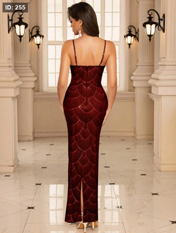 فستان حفلة مثير بأكتاف مكشوفة وأشرطة معلقة وخصر مفرغ مزين باللؤلؤ والترتر