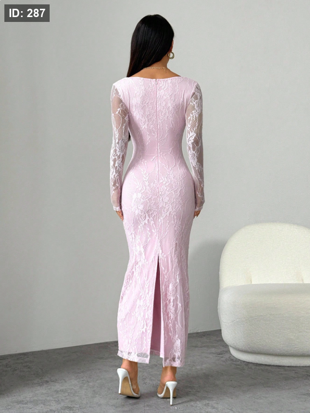 فستان ماكسي أسود ضيق للجسم بياقة مربعة وأكمام طويلة من الدانتيل على شكل S