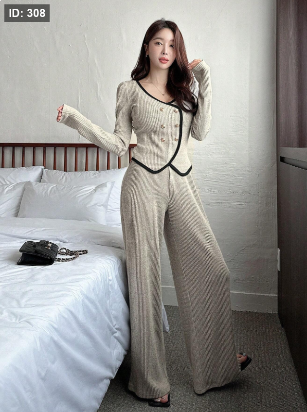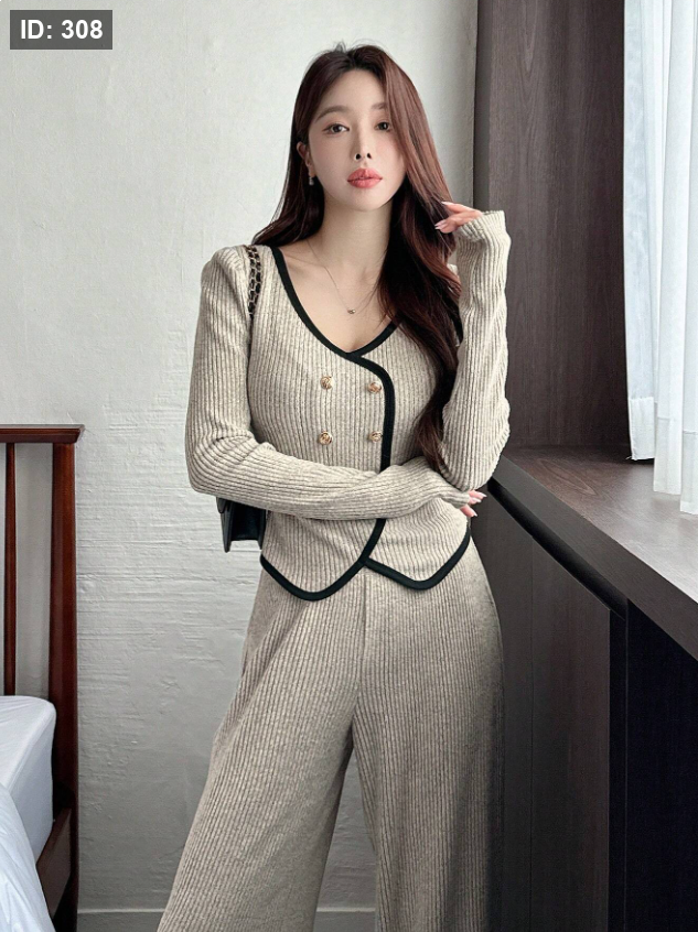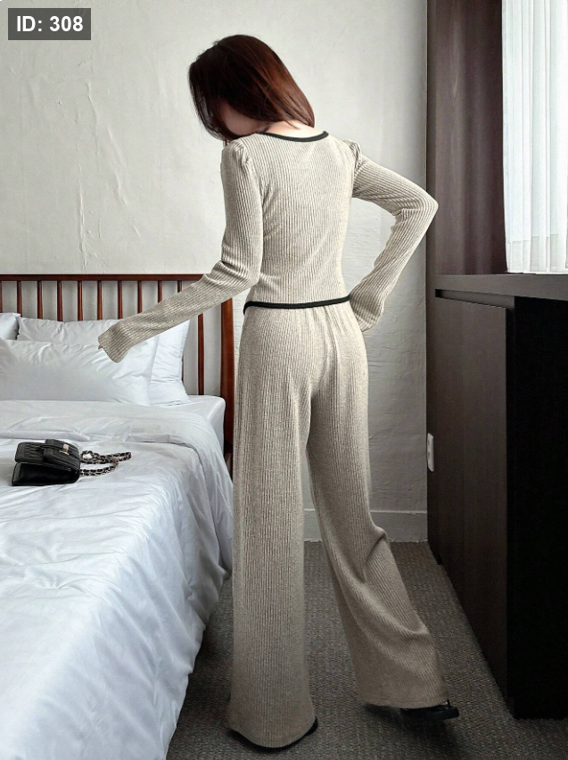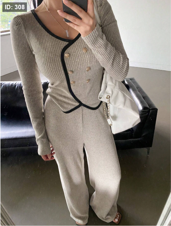 مجموعة ملابس علوية محبوكة ذات لونين متباينين وبنطلون ساق واسعة