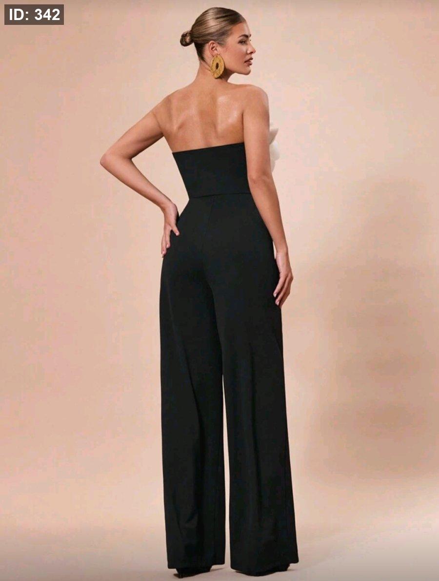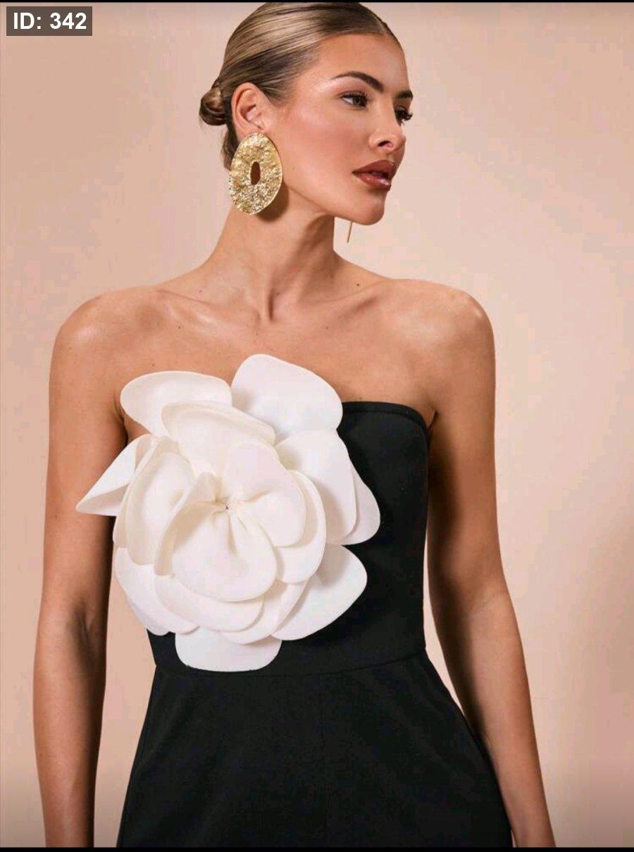 SHEIN BAE جمبسوت مقطعة بدون حمالات من قماش أسود والأبيض والأسود مزينة بزهور ثلاثية الأبعاد ، أنيقة لحفلات الكوكتيل ،المناسبات الرومانسية ، طبقة أساسية للخريف والشتاء ، الحفلات ،عيد الهالوين ،عيد الميلاد