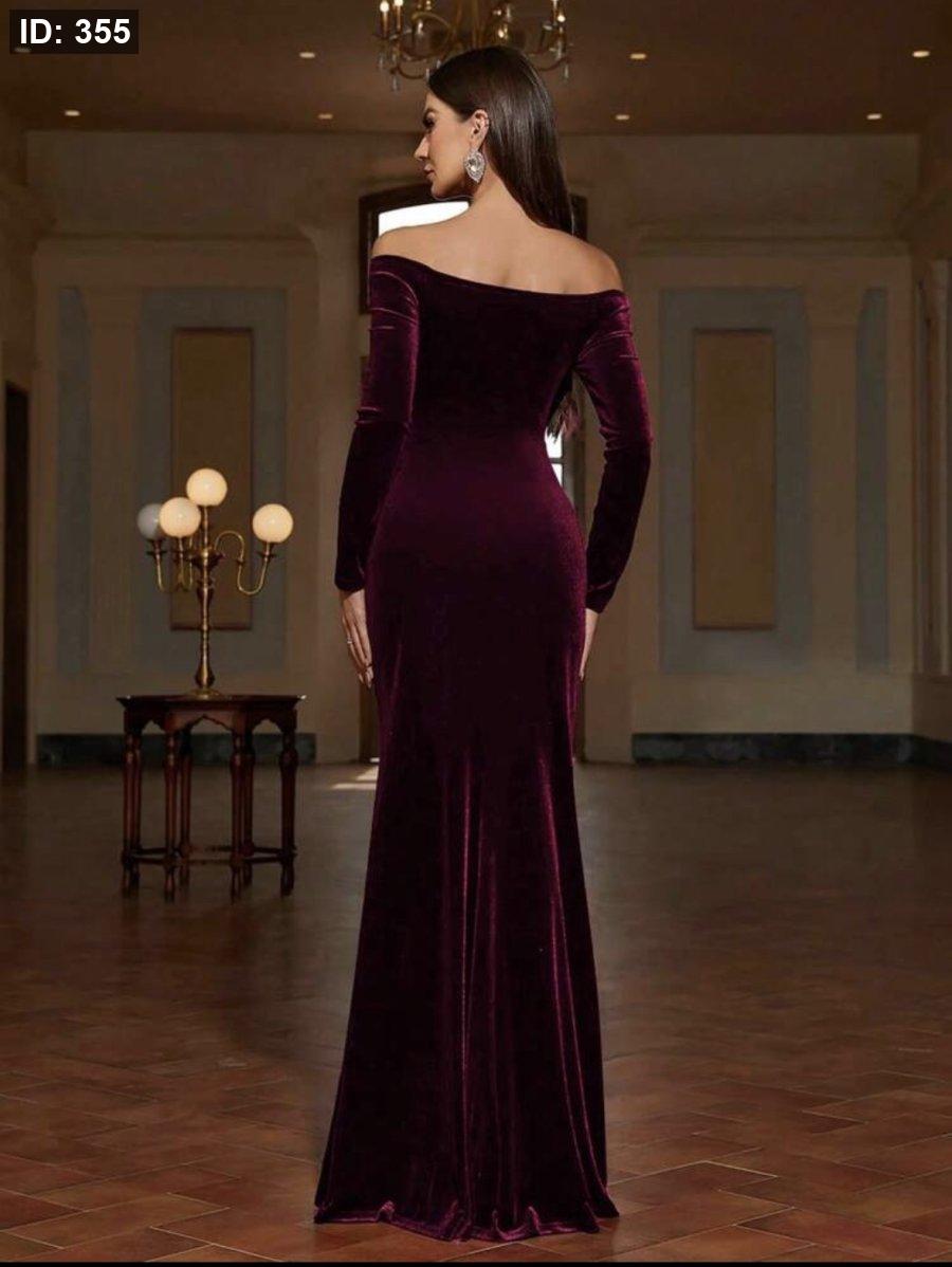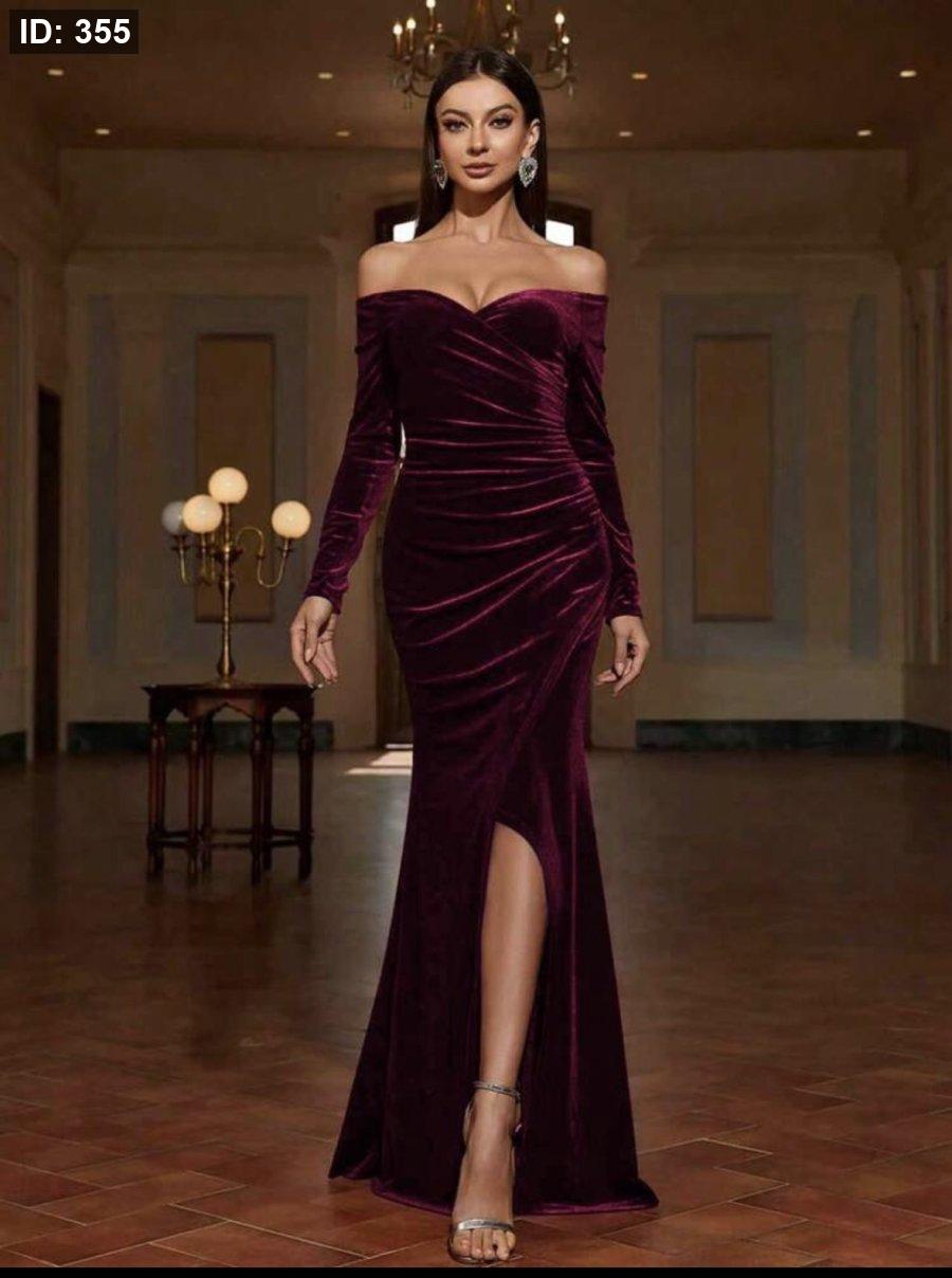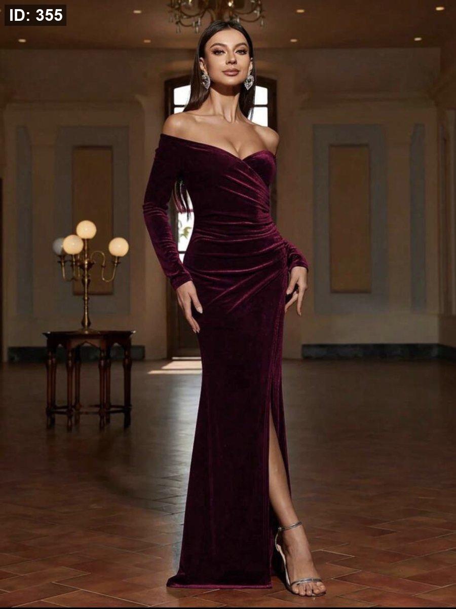 فستان نسائي بفتحة على الكتف وشق: فستان سهرة طويل الأكمام مطوي أنيق ومناسب، مثالي للحفلات والولائم