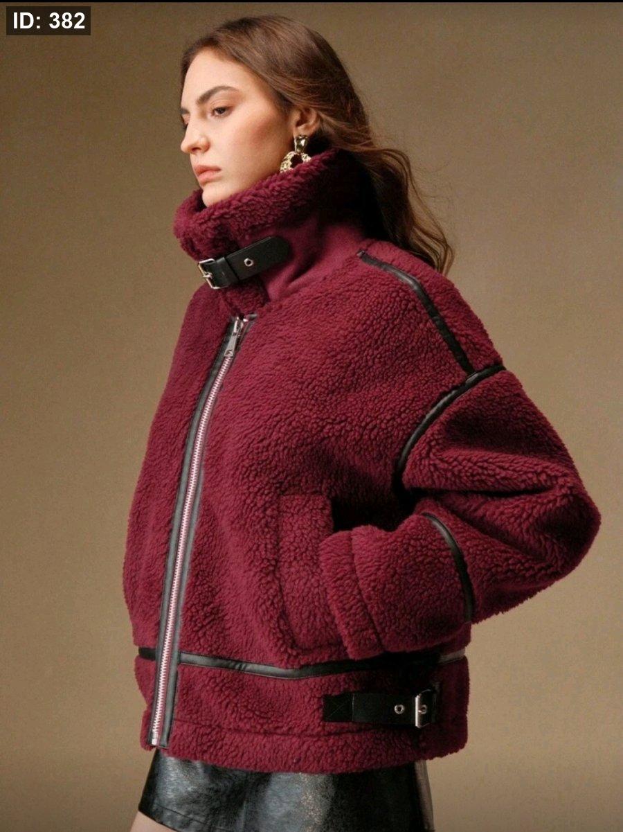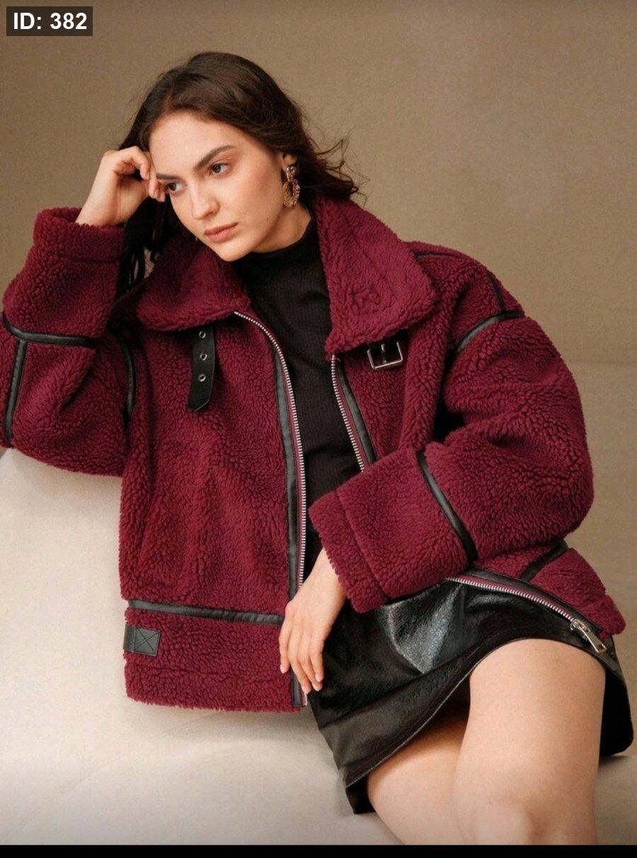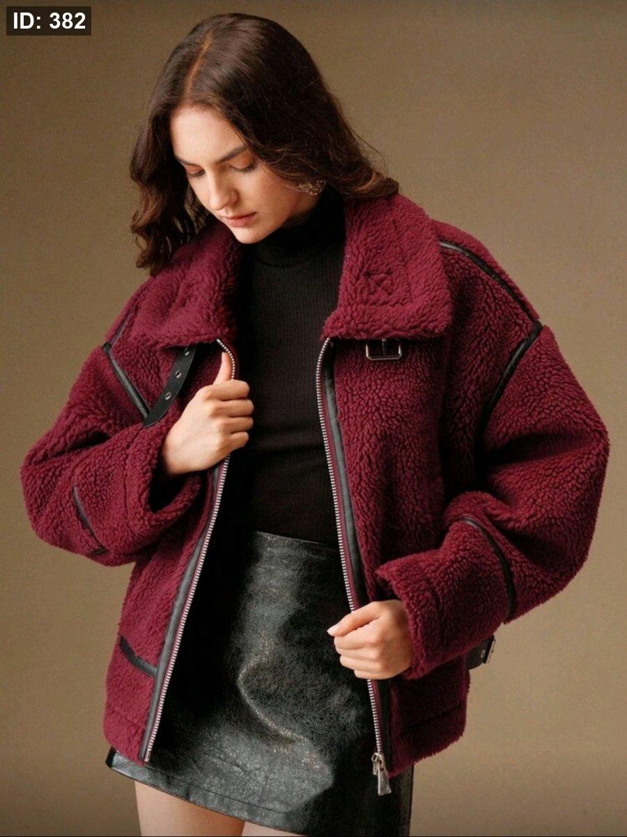 Anewsta جاكيت قصيرة فضفاضة مصنوعة من خليط الصوف الحملي والجلد الاصطناعي بتصميم رقعي، مناسبة للنساء في فصلي الخريف والشتاء