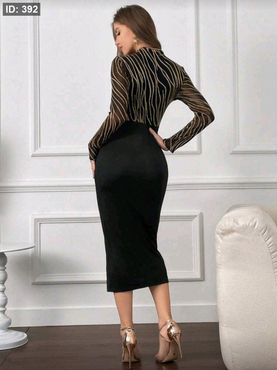 Modelyn فستان ضيق للنساء بخصر ملتوي، وياقة عالية، وأكمام طويلة، وفتحة جانبية بطبعة بلحافة من الفويل، لحفلات المساء الأنيقة، فستان أنيق مع شق في الفخذ، أكمام طويلة وخصر ضيق، تصميم رشيق وطويل باللون الأسود للسيدات، للارتداء اليومي والمناسبات لفصلي الربيع والخريف.
