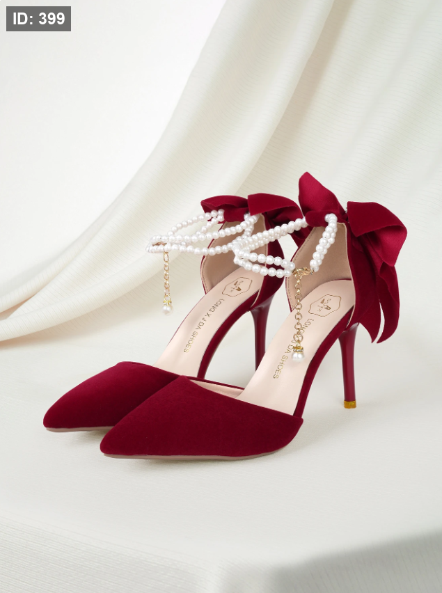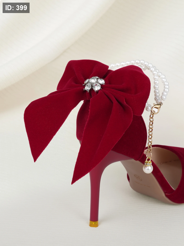 أحذية زفاف للنساء من الأحمر المخمل للموسم الخريفي/الشتوي، كعب عالي مزين بالفيونكة واللؤلؤ