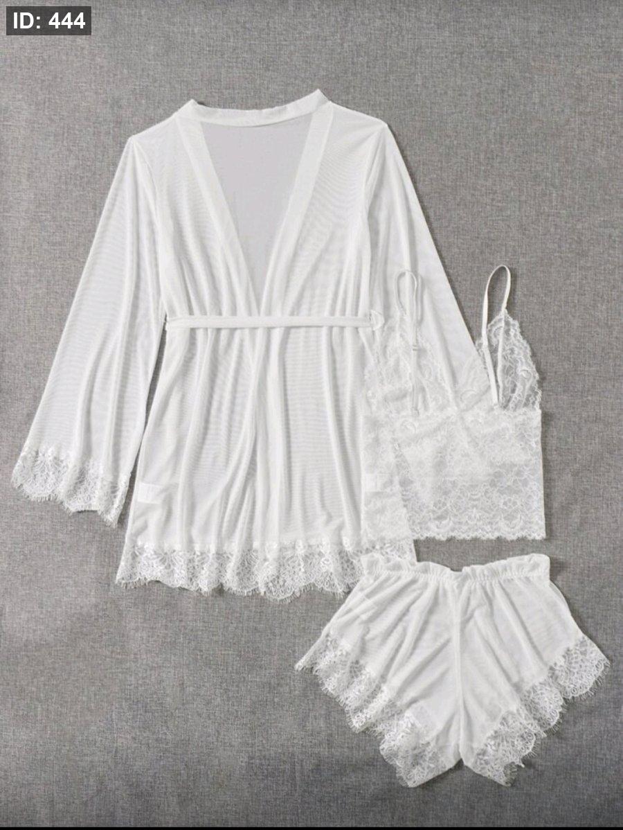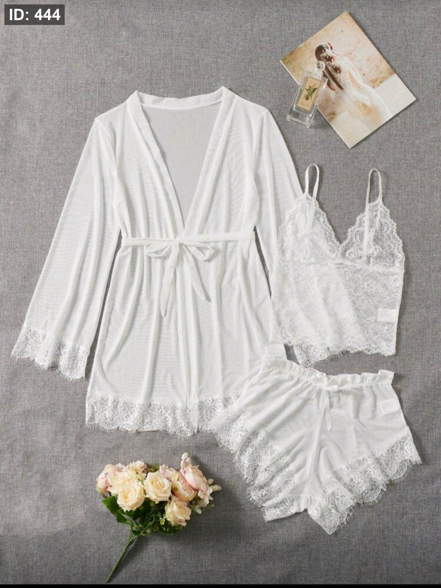 Crystal Vow طقم لانجري شبكي بدانتيل متباين مع روب و حزام - 4 قطع