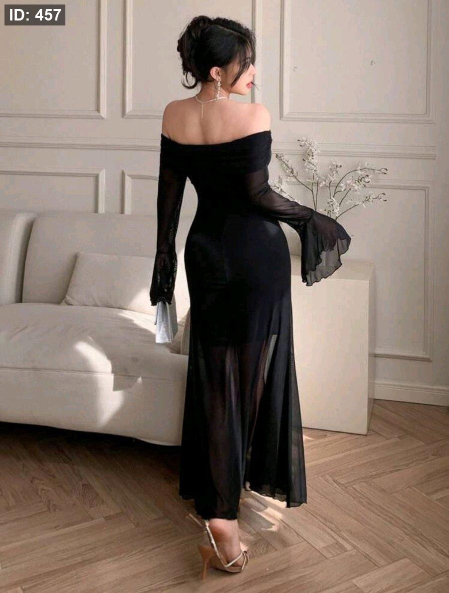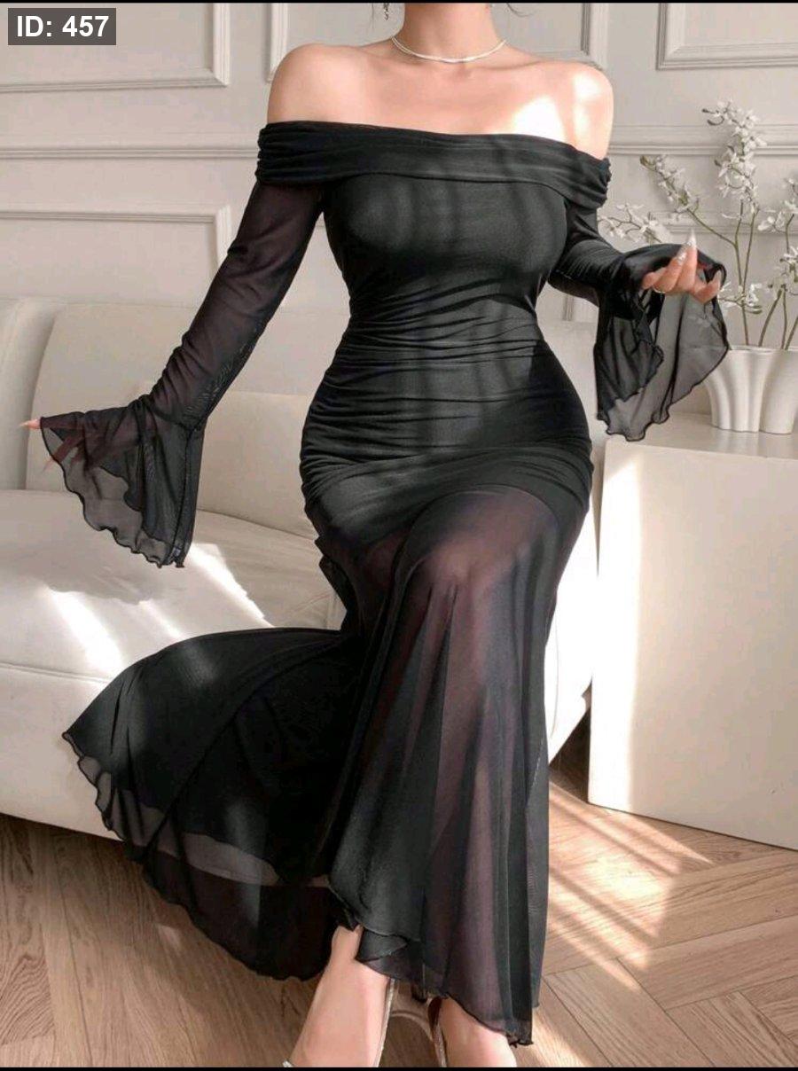 DAZY فستان ميدي مرصع بالشبك شفاف للنساء، بأكمام واسعة منسدلة وأكتاف مكشوفة، قصة جسم مثير وذيل سمكة الحوت رمضان