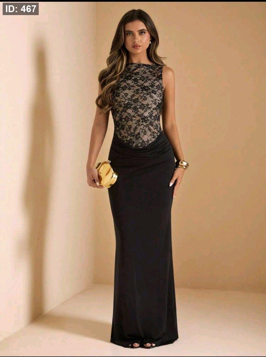 SHEIN BAE فستان أنيق أسود بدون أكمام مزين بالدانتيل والرقعات بتصميم ذيل حورية البحر، مناسب للزفاف والخدم والضيوف