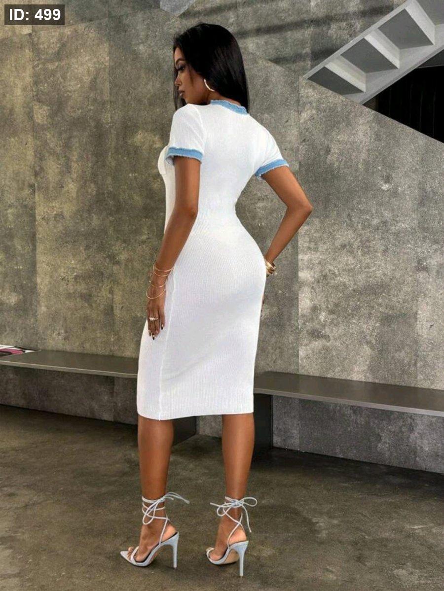 فستان تيشيرت محبوك بياقة أمامية على نصف الطول وأكمام قصيرة، بتصميم ألوان متباينة مع شراريب صيفي للنساء