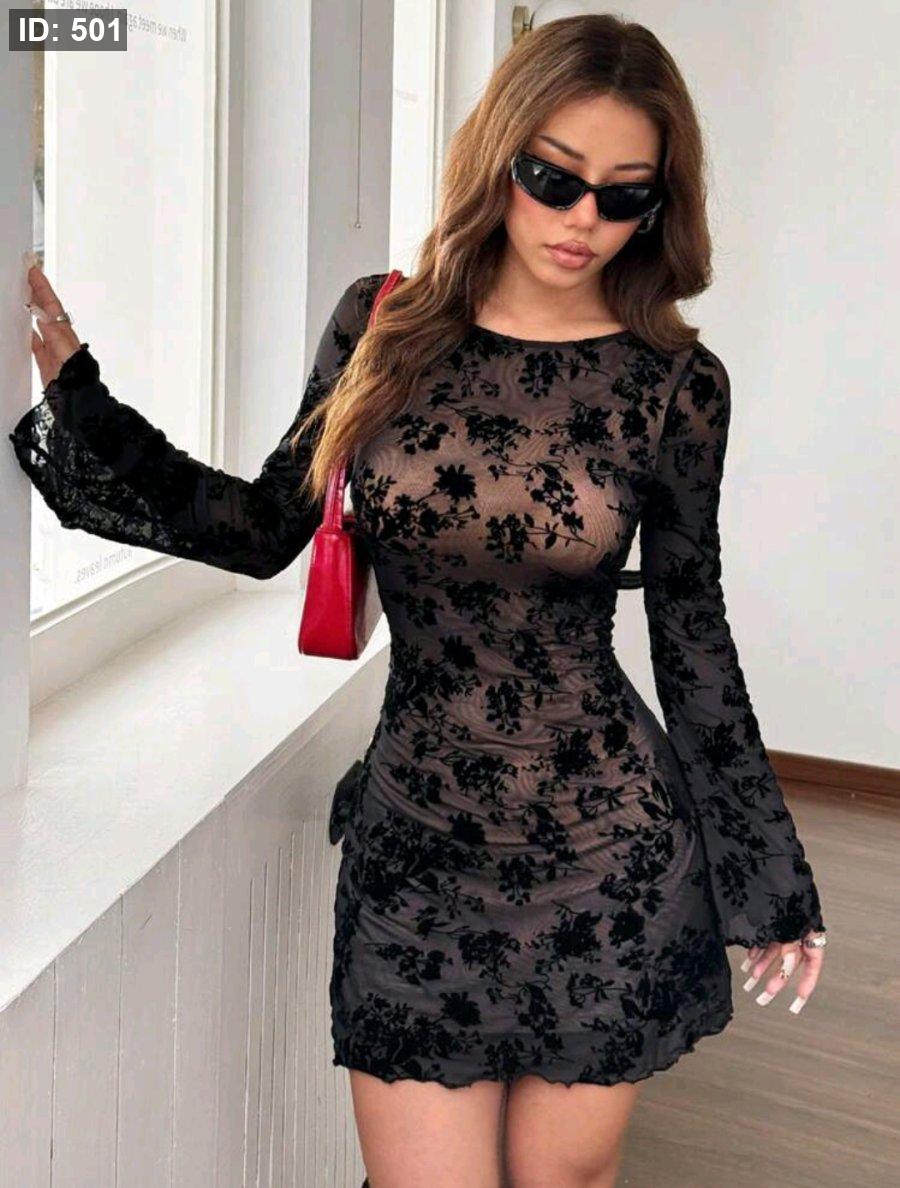 SHEIN EZwear فستان قصير من الشيفون الأسود بتصميم على شكل حرف A مع طبعة زهور، موضة جديدة خريف