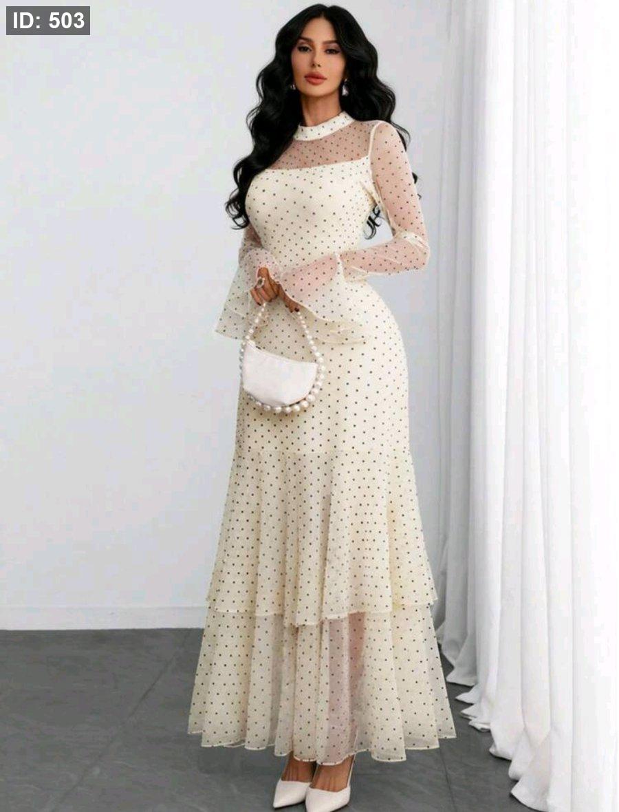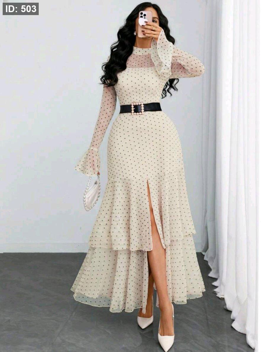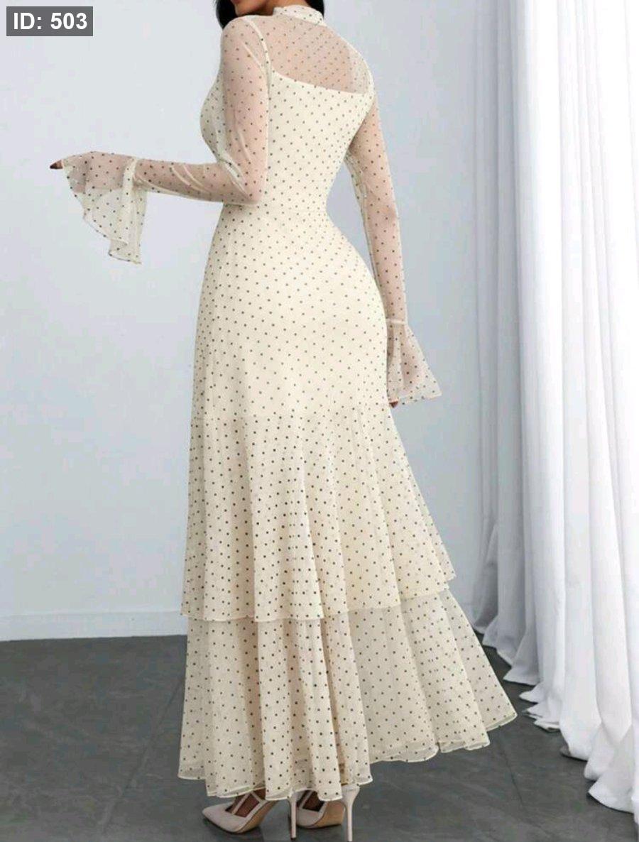 فستان نسائي حديث ذو طبعة نقاط رومانسية وجذابة وأنيقة، له ياقة عالية والهيم مزدوج الشق في الخصر، متعدد الطبقات، مناسب للمواعيد والعطلات والحياة اليومية في الربيع